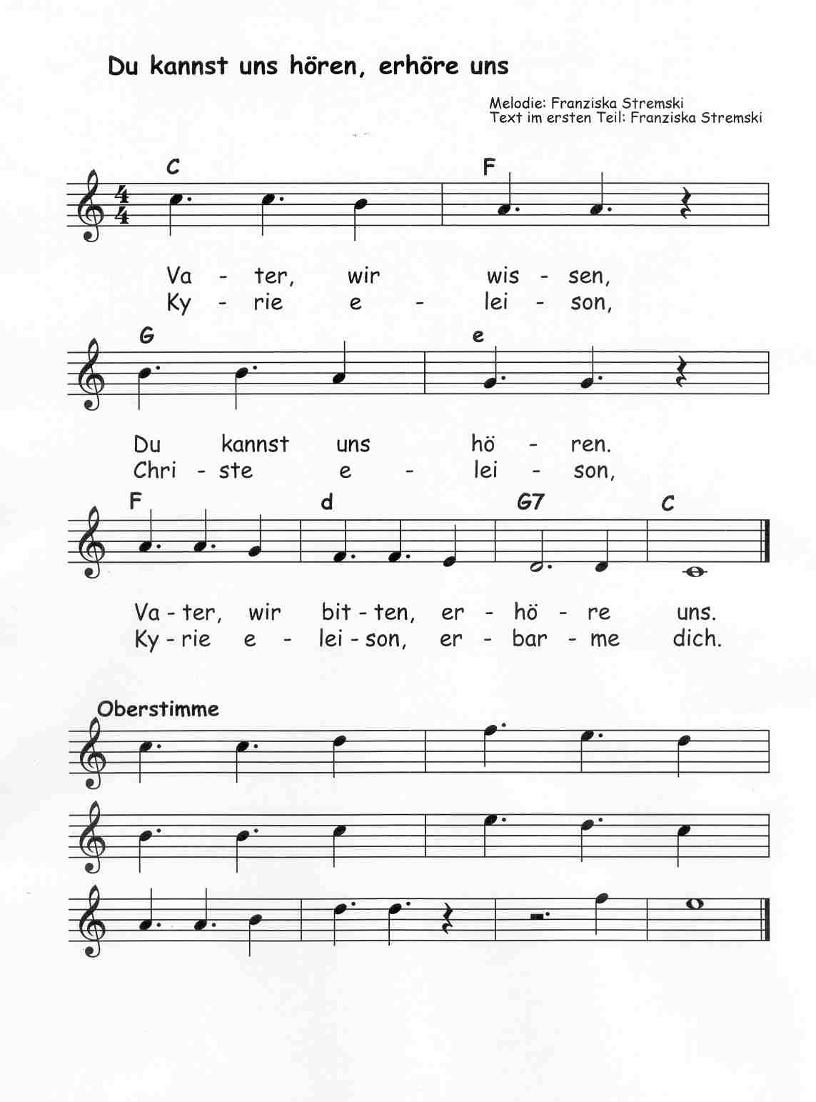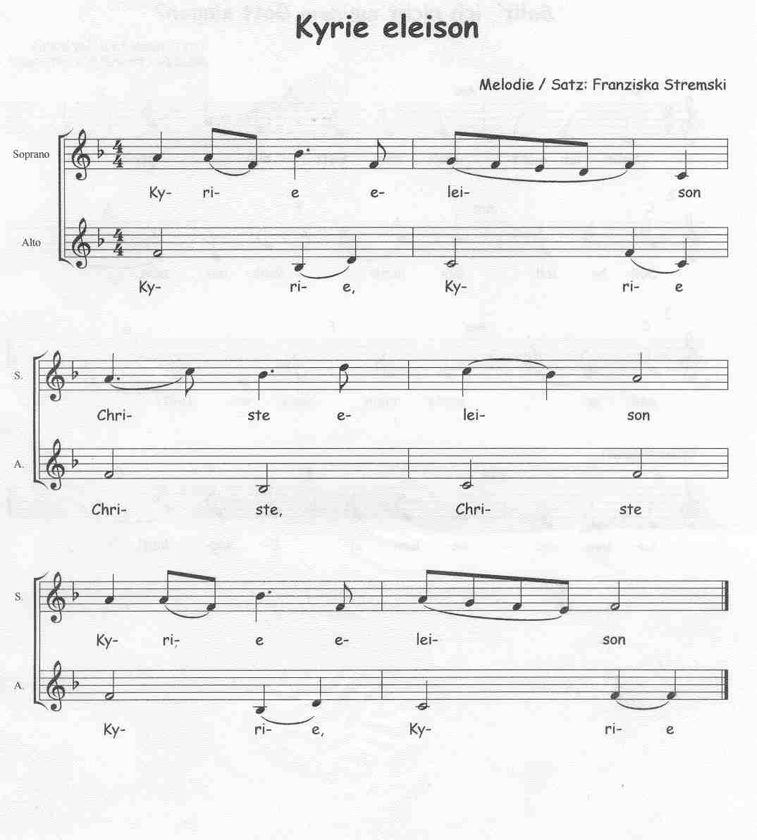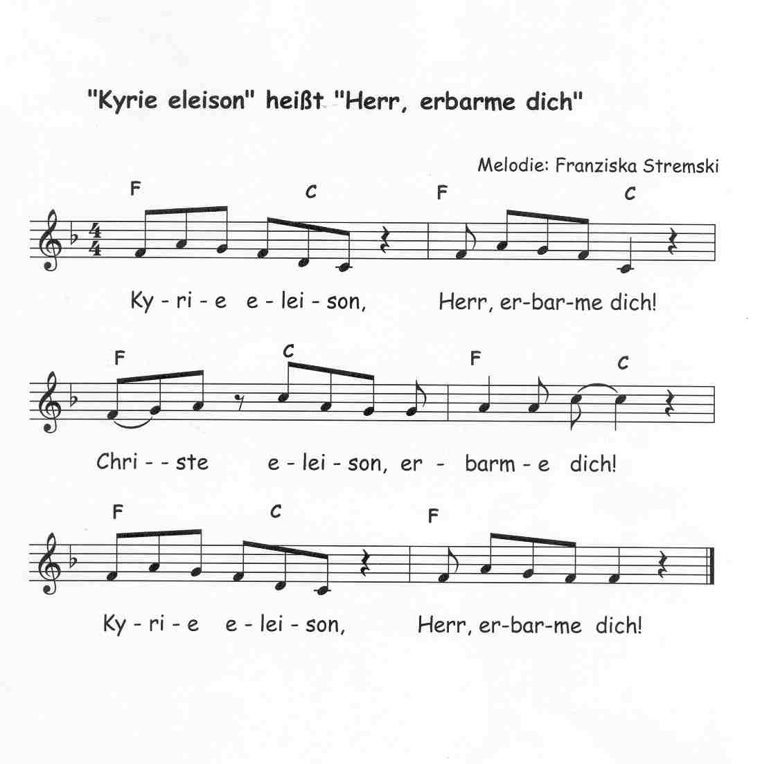 Die vier Liedrufe sind immer zu den Konfirmationen entstanden. „Kyrie eleison HEISST Herr, erbarme dich“ heißt so, weil man das HEISST in den Pausen der ersten und dritten Liedzeile singen kann. So ist es ganz nett für jüngere Kinder.